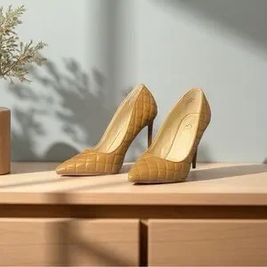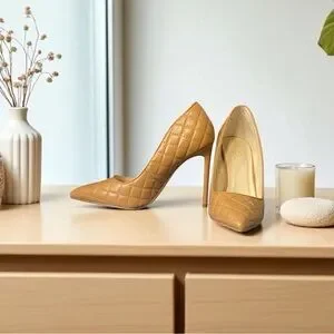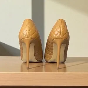 Cognac tan beige light brown quilted classic pointy toe stiletto pump heels. Pics are of the actual shoes. These heels are everything!!!!! Cute and sexy.