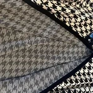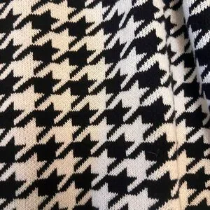 This striking cape jacket features a bold houndstooth pattern in classic black and white, offering a timeless and sophisticated look. Crafted from textured fabric, it provides warmth and style for cooler seasons. The cape design adds a unique flair, making it a standout piece in any wardrobe. Still in great condition!