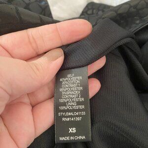 Perfect little black dress has combo of black crocodile skin print and mesh material. Racerback style with high front neckline. Hidden back zipper. Top bodice area is fitted into a fit-and-flare style skirt. Skirt area is lined in black.