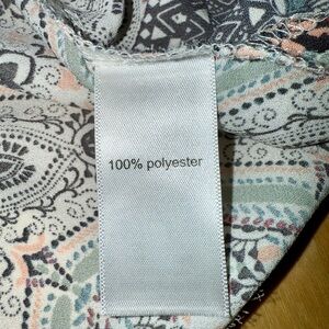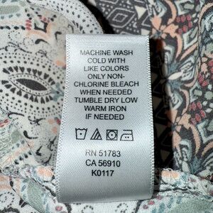 This Maurices blouse showcases a delightful mix of white, green, and coral tones, highlighted by a playful pattern of black and white illustrations. The short sleeves and round neckline offer a casual yet chic appearance. A contrasting band at the bottom adds a distinctive flair, making it a versatile piece for any wardrobe. Full length zip down the back.