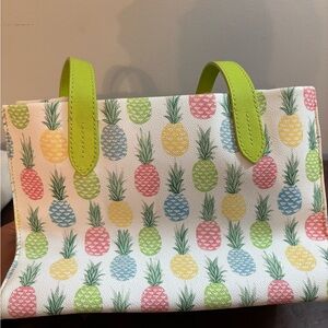 Charming tote with playful pineapple pattern. Features vibrant green handles. Perfect for a fun, stylish look.