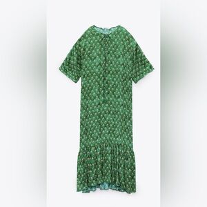 Zara Green Crinkle Floral Printed Short Sleeve Ruffle Maxi Dress XS