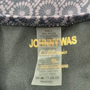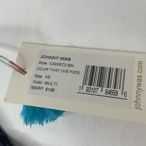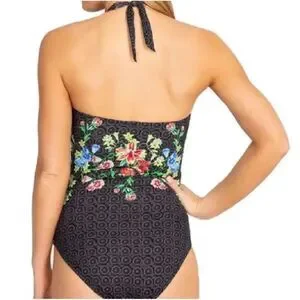 Johnny Was one-piece twist-front swimsuit in back with geo circle print background and bright floral print. Halter tie in back with padded cups. NWT made of nylon and elastane.