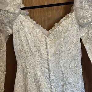 Stunning white gown featuring intricate beadwork and elegant design. Perfect for special occasions. Wedding Dress by Marys. It does. One in a garment bag for protection