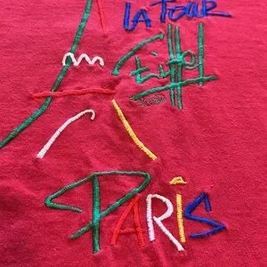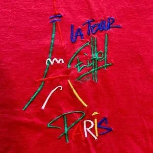 Vintage 90s Eiffel Tower Paris red t-shirt with colorful abstract embroidery. Unisex men’s fit