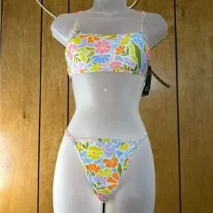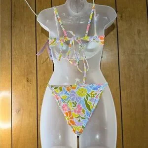 Bright floral bikini with adjustable straps. Ideal for beach days.