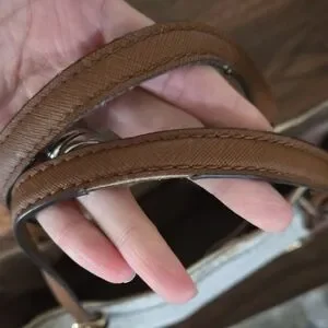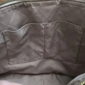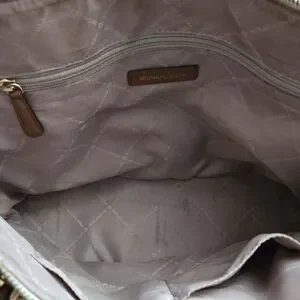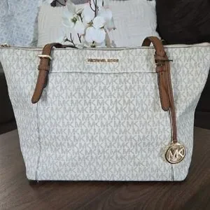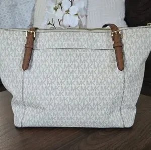 Chic Michael Kors tote with signature MK pattern. Features cream and tan colors. Ideal for everyday use.