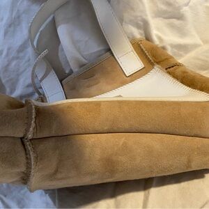 Elegant Never Used UGG Shearling-Lamb Skin Mini Tote. Tan with White/Trim. Front Pocket, Inside Zipper Pocket, Tie Closure. Ideal for daily use.
