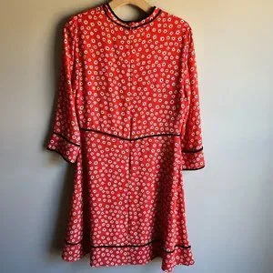 Cute red dress with floral pattern. Features black trim and bow detail. Three-quarter sleeves. Perfect for any occasion.
