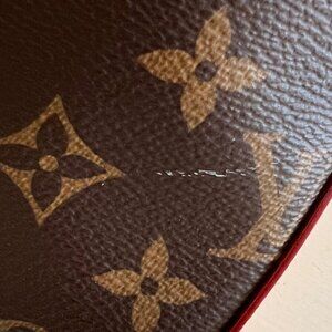 Well loved and cared for! Small mark on bottom leather (see photos) and oil/lotion minimal marking on handles (see photos) Washable marks on where the handle length has been placed. Small leather scratch on bottom right (see photos)