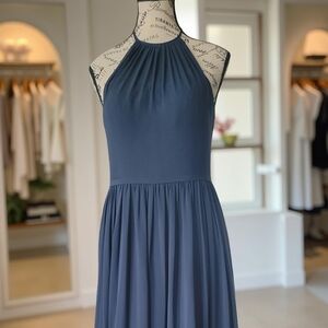 This elegant Azazie gown in a beautiful blue shade features a chic halter neckline and a sleeveless design, making it perfect for prom. The dress flows into a maxi length with a graceful silhouette, ideal for formal occasions. Crafted from a lightweight fabric, it offers a sophisticated and ethereal presence.