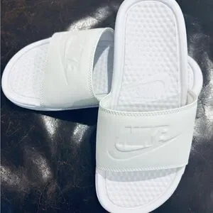 Experience ultimate comfort with these Nike sandals, featuring a sleek all-white design and a textured footbed for added grip. The minimalist one-piece construction and slip-on style make them perfect for casual outings. Enjoy the iconic Nike branding subtly embossed on the strap, enhancing the clean aesthetic.