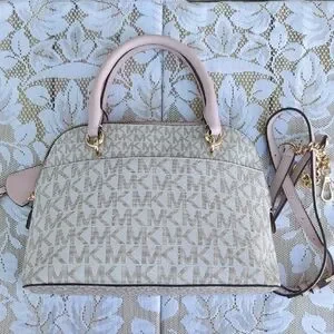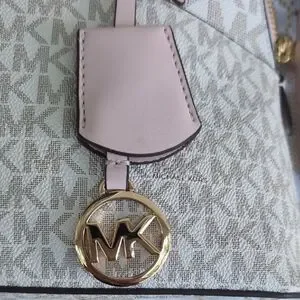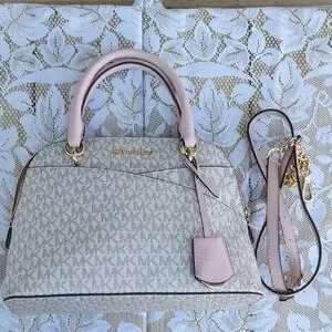 Stylish Michael Kors satchel with signature monogram. Features beige and pink tones. Includes detachable strap and gold accents.
