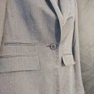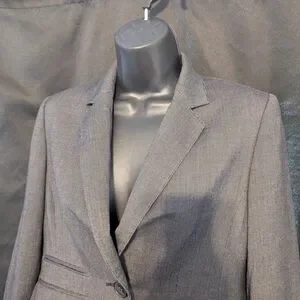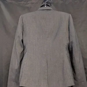 This Anne Klein blazer in a sophisticated gray hue features structured shoulders and a tailored fit, making it an ideal choice for professional settings. Its high-quality construction ensures a polished and timeless look. sadly the pockets are non-functional.