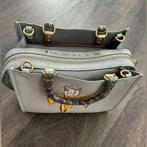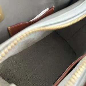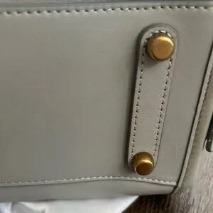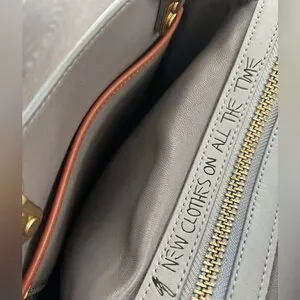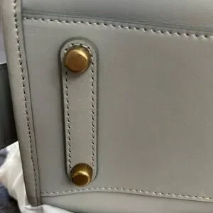 Good used condition. There are a few exterior marks, wear on the hardware on the feet, and a perfume smell. The smell is more apparent inside the bag; priced accordingly. Not indicative of my usual listings. Smoke free home. Shade of grey is a little darker in person.