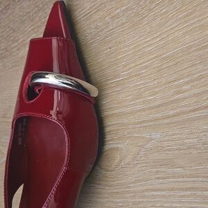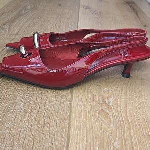Bold red patent heels with slingback design. Features sleek pointed toe and metallic accent. Perfect for a standout look.