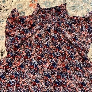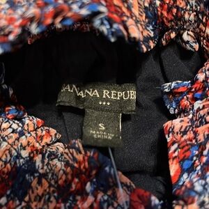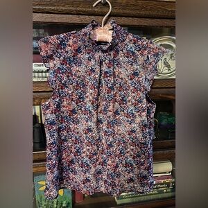 This elegant Banana Republic blouse features charming flutter cap sleeves and a shirred mock neck. Blue, red, white and pink abstract painterly floral confetti print. Fully lined.