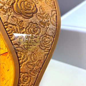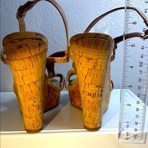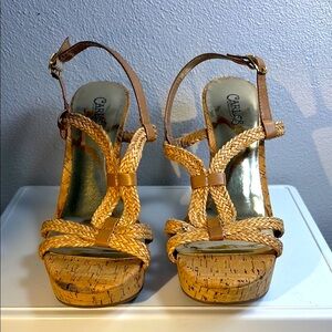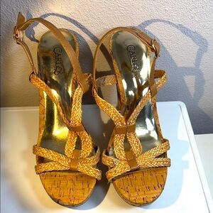 Step into summer sophistication with these tan wedges from Carlos by Carlos Santana. Featuring a 5” high cork platform and intricate woven leather straps, these sandals offer a perfect blend of casual elegance. The slingback design with a buckle closure ensures a secure fit for all-day comfort. Previously owned, good condition.