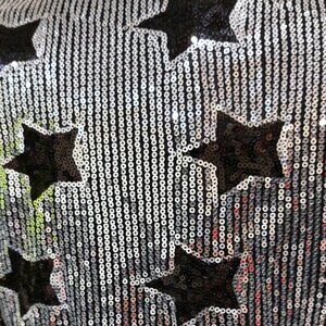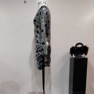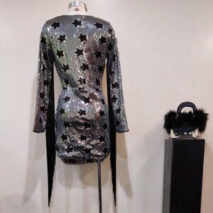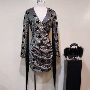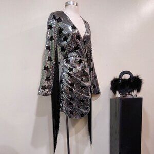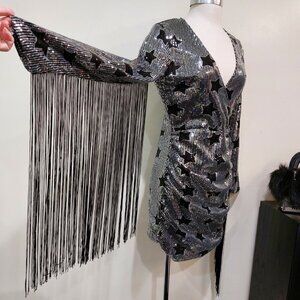 An insanely beautiful, ultra-chic cocktail dress from Nasty Gal that combines sexiness with sophisticated glam! Totally James Bond girl dress for your next gala, red-carpet event, or high-profile soirée. Comes in a vibrant Silver sequin that looks amazing in any light. Features beautiful star design in Black sequin, a flattering bodycon silhouette, plunge neckline, elasticized waist, STUNNING long fringe detailing that hangs from the sleeves, lightly padded shoulder, ruching on the sides, and smooth soft lining. This striking, impressive piece has a great movement; it looks and photographs very well from any angle and would be a perfect piece for a photoshoot. Made from high-quality 100% Polyester. Make the most of this stunner by teaming it with a sleek up-do, statement earrings, and barely their sandals for the ultimate out-out look. Size 6 (US size 6/UK size 10), the model wears a size 6 US. Approximate measurements flat: Pit to pit flat 23", Waist unstretched 13.5", Sleeve 24", front Length 34.5", Side Length 32" from shoulder to hem. NWOT. Come from a clean, smoke-free home.