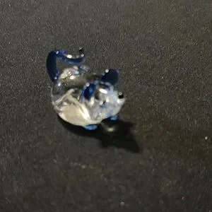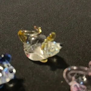 Set of three glass mouse figurines. Features clear, blue, and yellow accents. Perfect for decoration.