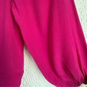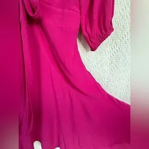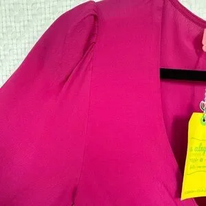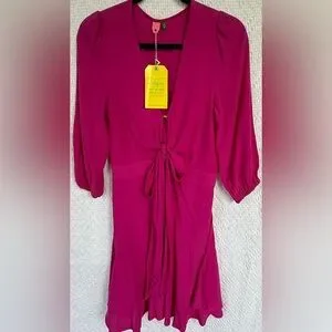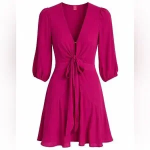 Farm Rio Alegria tie-front mini dress in a vibrant fuchsia pink. Features a deep V neckline, adjustable self-tie waist, flutter hem, and 3/4 puff sleeves with elastic cuffs. Lightweight, flowy fabric with beautiful movement — perfect for spring, summer, vacations, or events. New with tags.