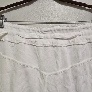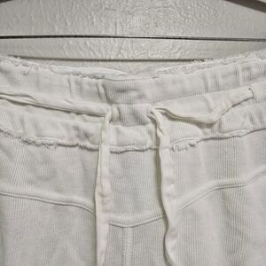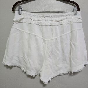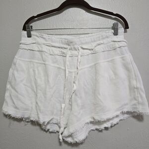 Frayed edges add texture and lived-in appeal to these laid-back knit shorts topped with a drawstring waist. In good condition