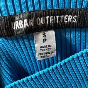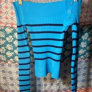Stylish off-shoulder sweater with blue and black stripes. Features button details on the side.