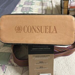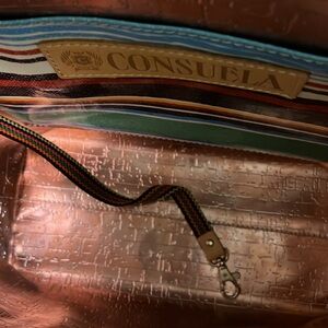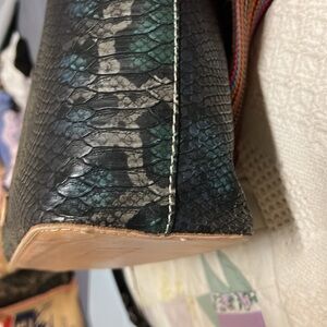 Elegant Consuela shoulder bag with a textured blue and gray design. Features a colorful strap for added style.Snakeskin. The Consuela Rattler Hobo. Slide pocket, c/c pocket,lanyard.2-straps detachable. Made in Mexico.