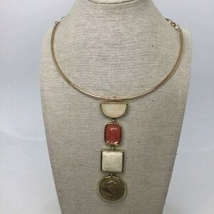 Make a bold statement with this stunning White House Black Market collar necklace. Featuring a sleek gold-tone choker band, this modern piece showcases a striking linear drop of four geometric faux stones: a creamy half-moon, a rich terracotta red square, a marbled ivory square, and a round earthy brown stone—all bezel-set in polished gold-tone frames.
