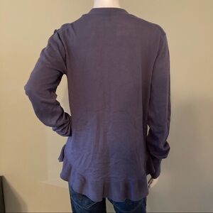 Hinge size medium ladies button cardigan with ruffled bottom. The color actually is a slate blue, however, I’m not able to get a picture that doesn’t show it looking like it’s purple. Approximate measurements armpit to armpit 19 inches. Shoulder to bottom front edge 27 inches. From a smoke free home.
