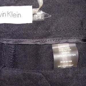 Size 14 - Women's Calvin Klein linen blend pants in the color black the material is 55% linen and 45% rayon, the lining material is 100% polyester in good preowned condition