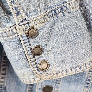 Vintage Women's Light Blue Distressed Denim Jacket Tommy Hilfinger Size L. This classic piece offers a timeless look with its light blue hue, perfect for any casual outing. Branded snap buttons in front and 3 button sleeve closure. 2 snap button pockets in front. Adjustable sides. Lightweight. Pre-ownedinexcellentcondition. Measuring flat approximately 20 inches armpit to armpit 22 inches long. #timeless #vintage #distressed #snaps #Adjustable #denim #blue #jean