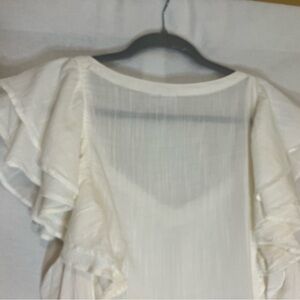 The Gap Peasant Cottagecore Ruffle V-neck Pintuck Blouse in size Large is a stylish and comfortable top perfect for women looking for a boho chic look. This solid white blouse features a flattering V-neck with ruffle accents and flutter sleeves, making it ideal for casual or travel occasions. Made from a blend of rayon and cotton, this lightweight and breathable blouse is perfect for the spring and summer seasons. The relaxed fit and basic style make it a versatile piece that can be dressed up or down for various coastal cowgirl, cottage, and prairie-themed outfits.