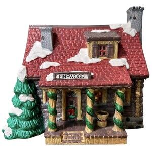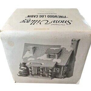 The Dept 56 Snow Village Pinewood Log Cabin from 1989 is a medium-sized ceramic Christmas village house featuring an illuminated log cabin with a bucket on the front porch, a pine tree and a wreath on the front door. Hand-painted in an American style, this retired piece is part of the Snow Village collection and comes in its original boxed packaging with a cord. Perfect for seasonal holiday displays, this vintage piece captures the charm of a cozy cabin in a wintery setting, making it suitable for display in any room during the Christmas season.