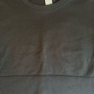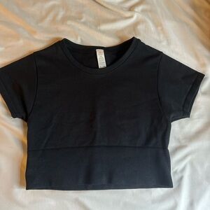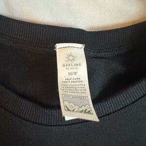 in perfect condition, only worn once aerie offline black sidewalk seamless cropped t-shirt. no longer sold, perfect basic tee, very comfy seamless material. has a flattering band around the waist! thick material, no flaws! perfect for working out and summer!!
