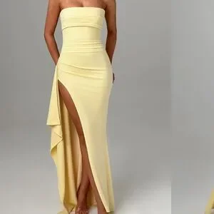 This elegant strapless dress in a soft yellow hue is perfect for any occasion. Its sleek design and side slit add a touch of sophistication.Babyboo only worn once