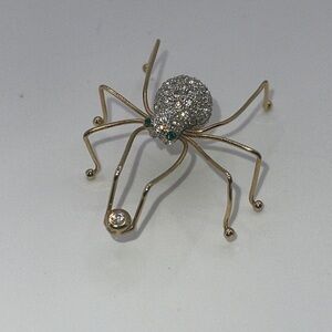 Elegant spider brooch with gold legs and a silver body. Features green accent stones for eyes.