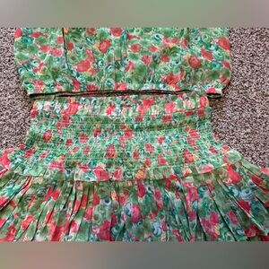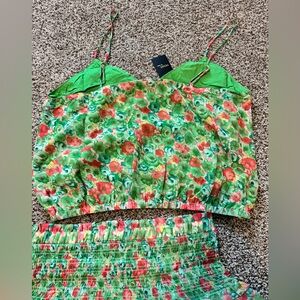 Embrace a fresh look with this floral green ruffle skirt and smocked lined mini skirt set. Perfect for any occasion, it offers a playful and stylish vibe.