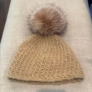 Elegant camel knit beanie with a soft fox fur pom. Adds a chic touch to any look.