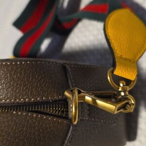This crossbody is perfect for any use, in a sophisticated brown/tan color, complemented by vibrant yellow accents. Its compact design is perfect for carrying everyday essentials, while the detachable strap adds a contemporary touch with its bold striped pattern.