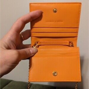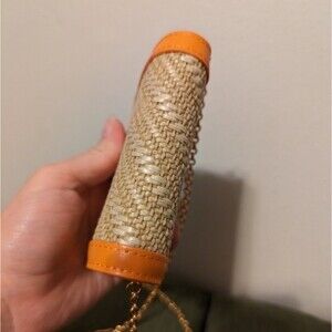 Stylish woven wallet with orange trim. Features a chain strap. Perfect for any occasion.
