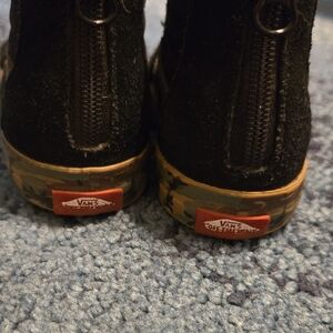 These Vans high-top sneakers feature a black and camo color scheme, perfect for making a bold statement. The classic design includes a durable canvas upper and the signature waffle sole for excellent grip. Zipper back closure. Ideal for everyday wear, these sneakers offer both style and comfort.