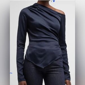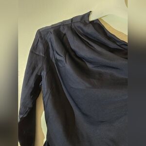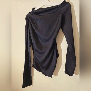 ALC one shoulder top asymmetrical long sleeve ruched blouse. Satin silky feel. Midnight blue shade. Concealed hook and zip fastening