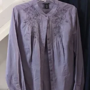 Elegant purple blouse with intricate embroidery. Features a button-up front and long sleeves.