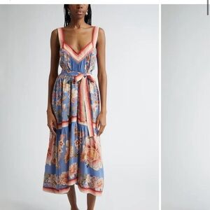 Vibrant FARM Rio midi dress with floral print. Features a tie waist and V-neckline. Perfect for a stylish look. Worn once!