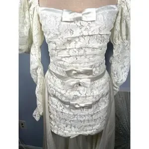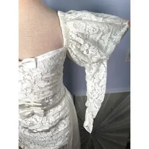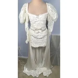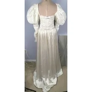 Elegant white lace maxi dress. Features puff sleeves and a flowing train. Perfect for special occasions. Dress is size medium and the detachable train is a large. Never worn out, only tried on, tags still attached.