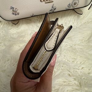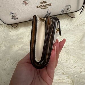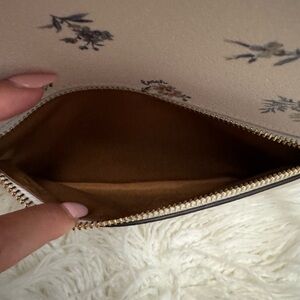 Like new coach floral backpack. About 10" in length and 12" high. There is a matching wallet, but unfortunately where it was stored there is some discoloration along the edges. Will throw in for free.