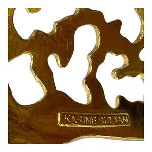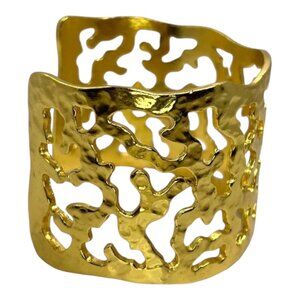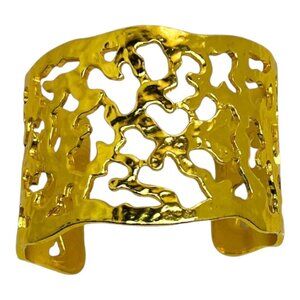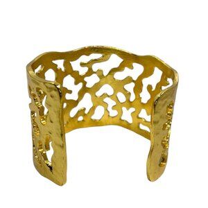 This exquisite Karine Sultan cuff bracelet features an intricate abstract cutout design, showcasing a luxurious gold-tone finish. Crafted with a hammered texture, it embodies timeless elegance and a vintage allure. A statement piece that adds sophistication to any ensemble.