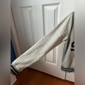Two toned gray long sleeve sweater with stripe details around the neckline, sleeve cuffs, and lower hem of the top. Snoopy design on the front. Made in China.