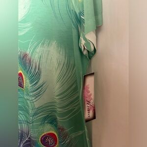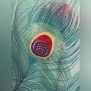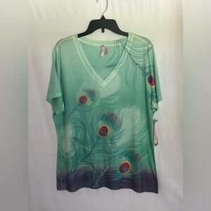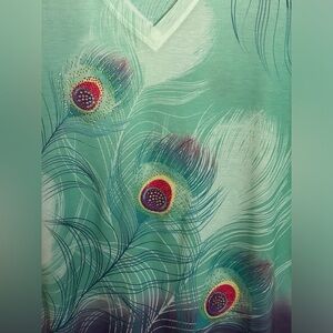 Embrace elegance with this stunning V-neck top featuring a vibrant peacock feather print. Perfect for adding a touch of color to your wardrobe. Such a fun, head-turning top.